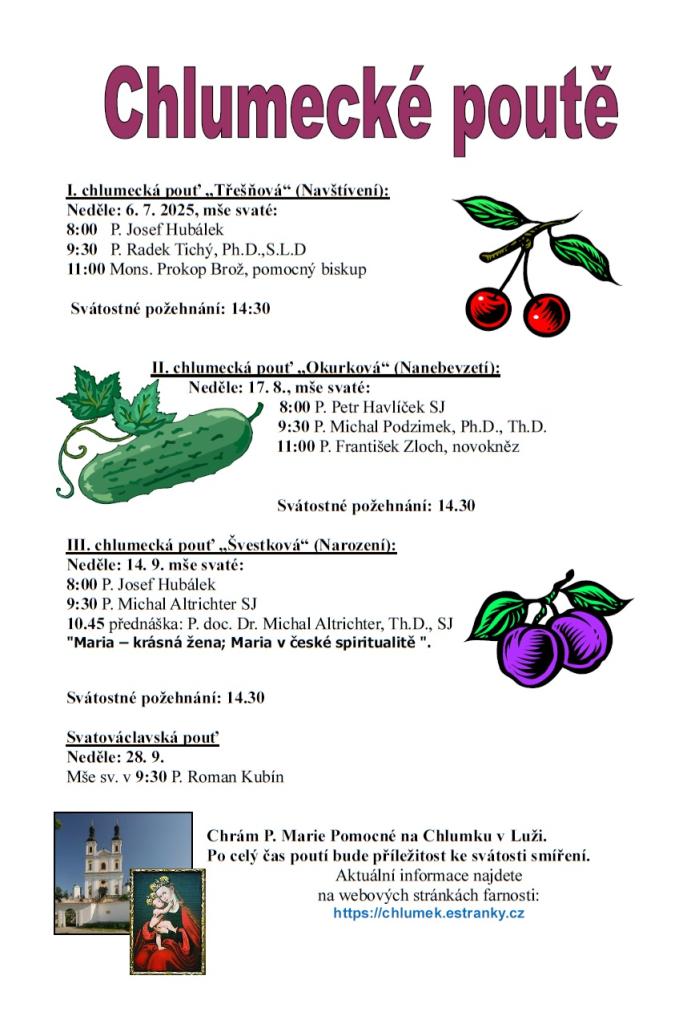 Přijďte se zúčastnit Chlumeckých poutí, které proběhnou v červenci, srpnu a září 2025. V rámci poutí se uskuteční mše svaté a svátostné požehnání, které povedou významní duchovní.