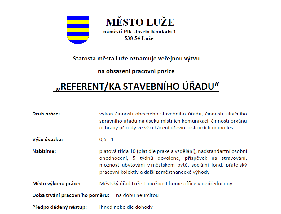 Město Luže vyhlašuje výběrové řízení na pozici referenta/referentky stavebního úřadu