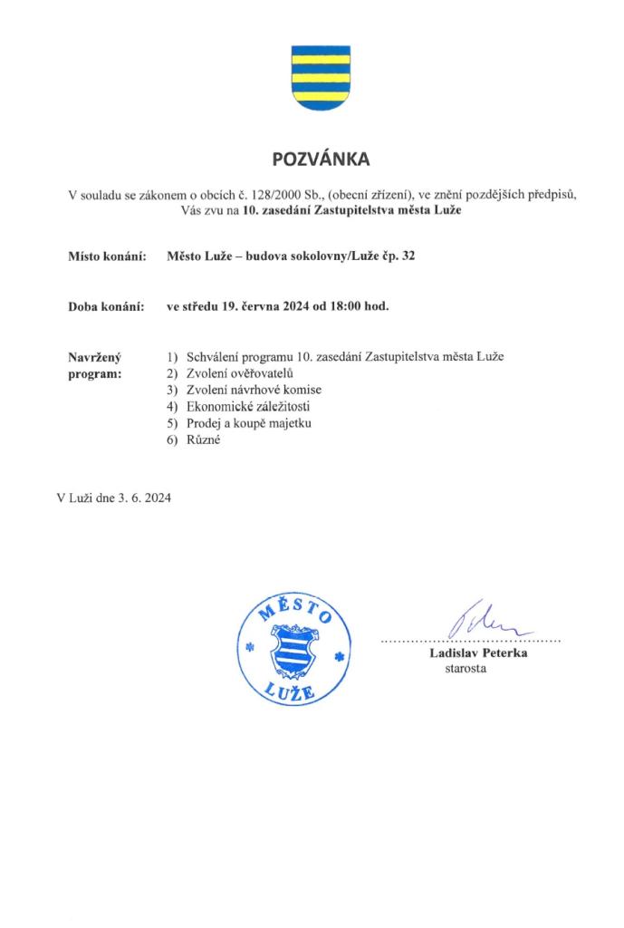 Pozvánka na zasedání Zastupitelstva města Luže č. 10 - středa 19. června 2024 v 18h. - sokolovna Luže.