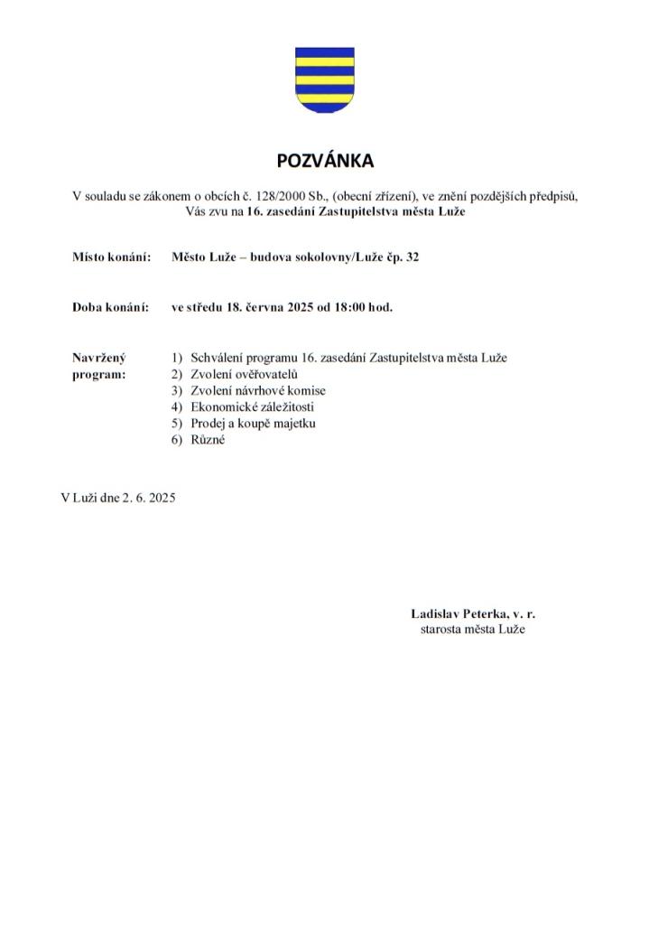 Pozvánka na zasedání Zastupitelstva města Luže č. 16