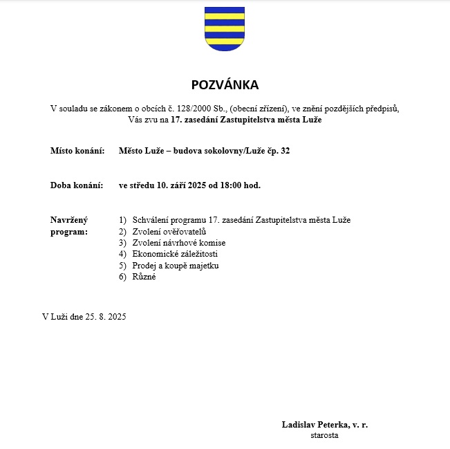 Pozvánka na zasedání ZASTUPITELSTVA MĚSTA LUŽE č. 17