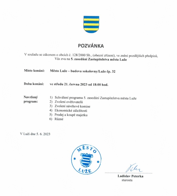 Pozvánka na Zastupitelstvo města Luže č. 5