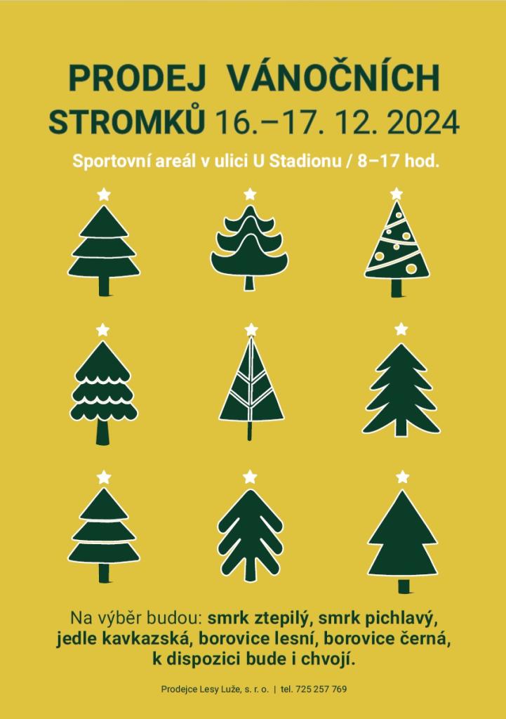 Nezmeškejte prodej vánočních stromků, který se uskuteční 16. a 17. prosince 2024 ve sportovním areálu U Stadionu. Prodej zajišťuje Lesy Luže,s.r.o.