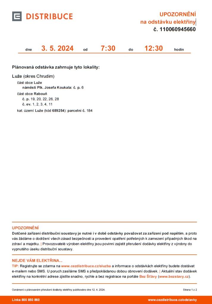 UPOZORNĚNÍ na odstávku elektrické elektřiny