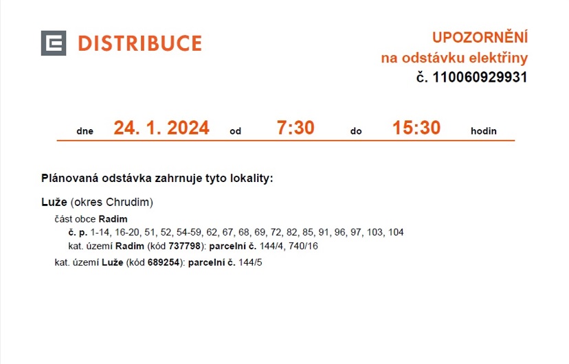 UPOZORNĚNÍ na odstávku elektřiny č. 110060929931