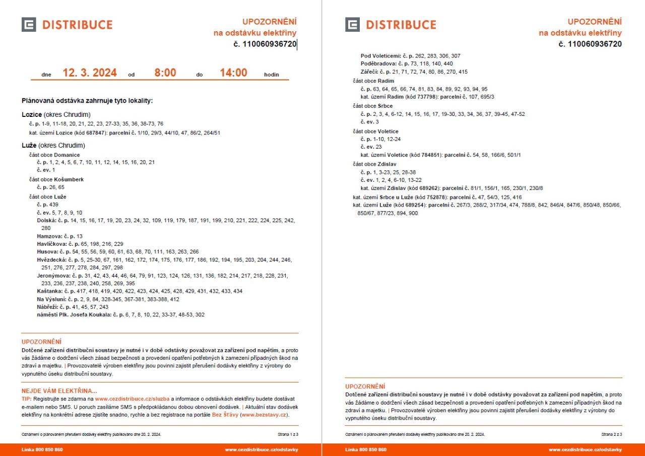 UPOZORNĚNÍ na odstávku elektřiny č. 110060936720